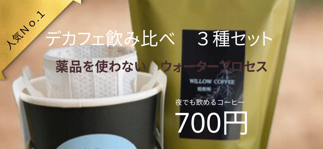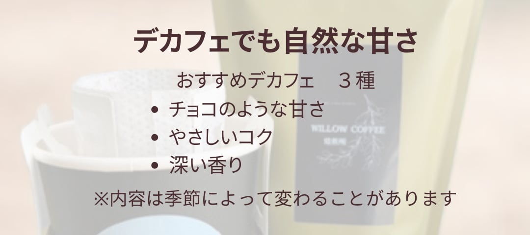 夜でも楽しめるスペシャリティデカフェ。 人気のデカフェを飲み比べできる ドリップバッグ3個セットです。 ウォータープロセス製法の 薬品を使わない自然なデカフェ。 カフェインを気にせず 夜でもコーヒーを楽しめます。 コーヒー好きの方はもちろん 妊娠中の方やカフェインが気になる方にもおすすめです。 【セット内容】 おすすめデカフェ ドリップバッグ3個 ※内容は季節によって変わることがあります 【こんな方におすすめ】 ・夜でもコーヒーを楽しみたい ・カフェインを控えている ・デカフェを試してみたい ・コーヒー好きな方へのプチギフト 【Willow Coffeeのデカフェ】 薬品を使わない ウォータープロセス製法。 デカフェでも自然な甘さと香りを楽しめます。 【配送について】 全国一律送料 ※4,980円以上のご購入で送料無料 ドリップバッグやギフトなど 他の商品と組み合わせてご注文いただけます。 【コーヒー豆のご注文】 コーヒー豆は LINE・お電話・Instagram DMからも ご注文いただけます。